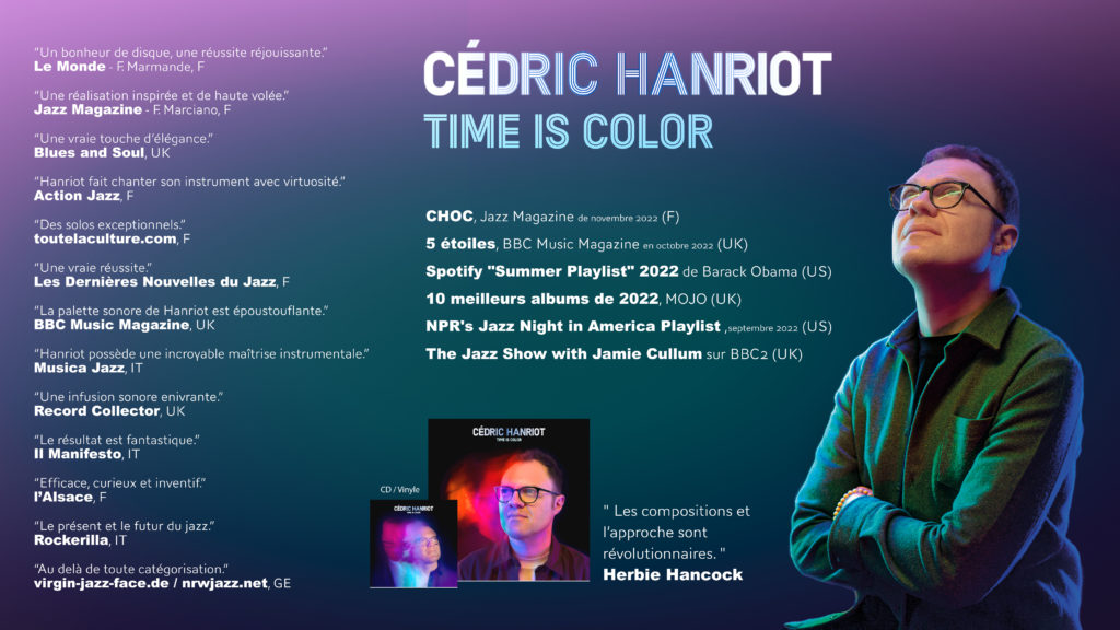 Time is Color Vol.2 est le nouvel opus du polyvalent polymath Cédric Hanriot. Contributeur clé à de multiples projets récompensés par des GRAMMY AWARDS, collaborant avec des sommités telles que Herbie Hancock, Dianne Reeves et Terri Lyne Carrington, pour n’en citer que quelques-unes, Cédric Hanriot s’est forgé une réputation de pianiste, de concepteur sonore, de compositeur et d’arrangeur très demandé, qui lui permet d’apporter des améliorations uniques à un éventail très diversifié de projets musicaux réussis. Avec Time is Color Vol.2, il présente son art sous sa forme la plus sincère : une évolution par rapport à son projet original Time Is Color, sorti en 2022, qui a reçu des éloges universels (élu CHOC Jazz Magazine, 5 étoiles BBC Magazine et classé parmi les dix meilleurs albums de l’année 2022 par le magazine anglais MOJO) et s’est même retrouvé sur la fameuse playlist Spotify estivale de l’ancien président américain Barack Obama cette année-là.